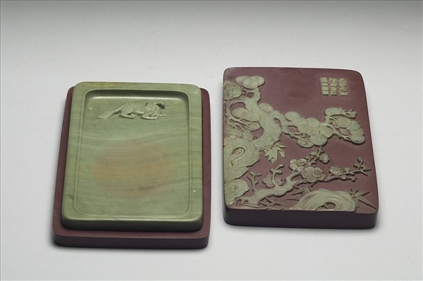 方形綠色石硯,石質潤澤,硯緣內側起細棱,ㄇ形池,池下浮雕一回首獨角獸,獸首與獸身上方高浮雕於池下方。硯面留一較粗的橢圓形作墨堂,尚稍留硃痕,餘皆打磨光滑。全硯通體有深淺不同之綠色天然橫紋。硯背周邊起寬棱,中央凹下處陰刻行書銘:「以靜為用,是以永年。」並陰刻二行四字篆體方印:「康熙宸翰」。紫色方形硯盒,盒蓋與盒身藉硯身扣合。盒用紫綠兩層色石琢製而成,盒為紫色,蓋面紋飾為暗綠色,浮雕一株古松自壽石後伸出,松針組成橢圓形;一株老梅自蓋面左下角向右方生長,梅花有正,有側,有仰,有俯,有含苞、有盛開;壽石、松、梅之間,有綠色與紫色竹葉掩映其中。蓋面右上方嵌視一片方形紫綠兩層色石,其上浮雕五言詩二句「高節依虯幹,幽相近墨池」,並浮雕二篆體方印:「九」、「如」,前者是陽文,後者乃陰文。盒背周緣起一圈寬棱。