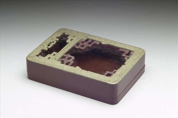紫色方形硯盒,盒用紫綠兩層色石琢製而成,盒身呈紫色,蓋面紋飾有綠紫色兩層,表面一層為綠色,微泛黃,浮雕兩兩相視的仿古龍紋,龍首在蓋的上方;中蓋內又浮雕二仿古龍首,將蓋面分成上下兩部分。下層方框之四角各巧雕一紫色仿古龍紋,紫色部分龍紋較綠色部分龍紋低陷。蓋內嵌一玻璃,可透視硯面。盒背周緣起一圈寬棱,表面並有一層褐黃色塗料,使盒色更亮麗。