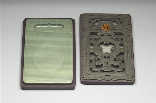 方形綠色石硯,石質潤澤。曲弧形池,池周淺浮雕勾雲紋,並延飾至硯面下方。硯面留一較粗的橢圓形作墨堂,餘皆打磨光滑。全硯通體有深淺不同之綠色天然橫紋。硯與盒身密合,目前暫無法分開,從原帳冊之硯背有「御銘」一印。暗紫色方形硯盒,盒蓋與盒身藉硯身扣合。盒用紫綠兩層色石琢製而成,盒為暗紫色層,蓋面紋飾為墨綠色層。蓋面紋飾分成兩層:上層成橫長方框,內圈起細棱,框面浮雕乳丁紋,框外高浮雕二夔龍紋,龍首雕於上方兩隅,龍身盤繞於框外,龍爪並延伸入框內,框下嵌一片玻璃;下層成豎長方框,內圈起細棱,框面浮雕乳丁紋,框內中央鏤雕一變形桃實與變形磐紋,框外雕飾二夔龍紋,龍身盤繞於框外,龍爪並延伸入框內與桃、磬相接,龍首雕於框外下外緣,二首間飾以一圓圈與綬帶紋,框下另嵌一片玻璃。兩方框間浮雕一元寶形紋飾,中央嵌一圓形土黃色石,鏤雕團壽字,四隅浮雕仿古變形龍首紋。蓋面紋飾有「慶壽」之意。盒背周緣起一圈寬棱,表面並有一層褐黃色塗料。