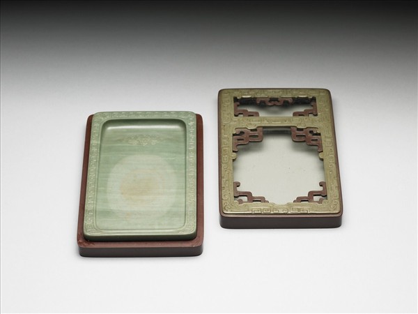 方形綠色石硯,石質潤澤,硯面周邊除下邊外,餘三邊浮雕S型方回紋,並突起周棱以分隔硯面與紋飾。ㄇ形池,池之下方淺浮雕一變形蝙蝠紋。硯面留一較粗的橢圓形作墨堂,且略留硃痕,餘皆打磨光滑。全硯通體有深淺不同之綠色天然橫紋。硯背周邊起寬棱,中央凹下處陰刻行書銘:「以靜為用,是以永年。」並陰刻二行四字篆體方印:「康熙宸翰」。紫色方形硯盒,盒蓋與盒身藉硯身扣合。盒用紫綠兩層色石琢製而成,盒身為紫色,蓋面紋飾有綠紫色兩層,表面一層為綠色,微泛黃,浮雕兩兩相視的仿古龍紋,龍首在蓋的上邊棱,二龍舌吐出相接;中上方又浮雕二仿古吐龍首,龍舌連成一橫欄,將蓋面分成上下兩部分。下層方框之四角各巧雕一紫色仿古吐舌龍,紫色部分龍紋較綠色部分龍紋低陷。紋飾下面嵌一玻璃,可透視硯面。盒背周緣起一圈寬棱,表面並有一層褐黃色塗料,使盒色更亮麗。