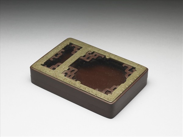 紫色方形硯盒,盒用紫綠兩層色石巧雕而成,盒身為紫色,蓋面紋飾有綠紫色兩層,表面一層為綠色,微泛黃,浮雕兩兩相視的仿古龍紋,龍首在蓋的上邊;中蓋內又浮雕二仿古龍首,將蓋面分成上下兩部分。上層方框有巧雕紫色龍紋,下層方框之四角各巧雕一紫色仿古吐舌龍,紫色部分龍紋較綠色部分龍紋低陷。蓋內嵌一玻璃,可透視硯面。盒背周緣起一圈寬棱,表面並有一層褐黃色塗料,使盒色更亮麗。