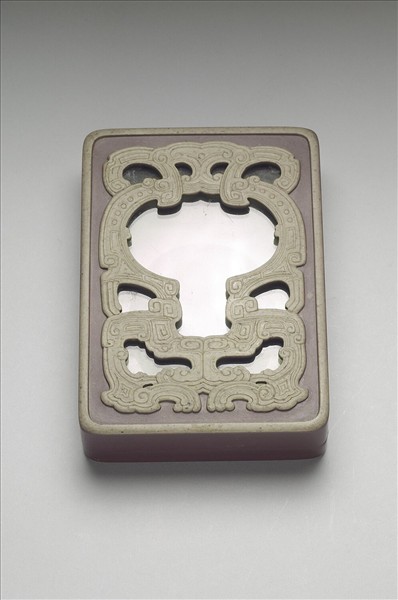 紫色方形硯盒,盒蓋利用紫綠兩層色石巧雕鏤空帶狀仿古紋飾,鏤空部位略呈獸面紋,自上而下是雙角、雙眼、大鼻與口部,獠牙上翹。紋飾下嵌一玻璃,可透視硯面。盒背周緣起一圈寬棱。
