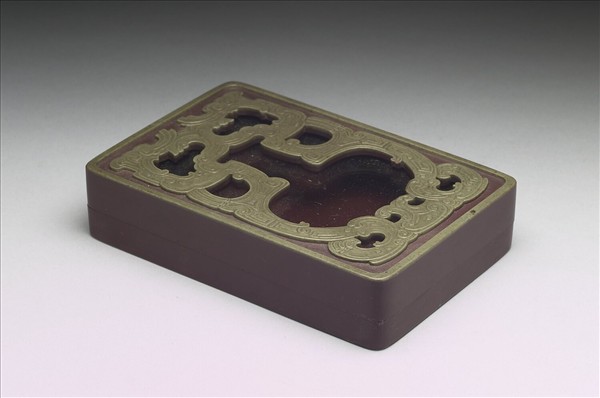 紫色方形硯盒,盒蓋利用紫綠兩層色石巧雕鏤空帶狀仿古紋飾,鏤空部位略呈獸面紋,自上而下是雙角、雙眼、大鼻與口部,獠牙上翹。紋飾下嵌一玻璃,可透視硯面。盒背周緣起一圈寬棱,表面並有一層褐黃色塗料。