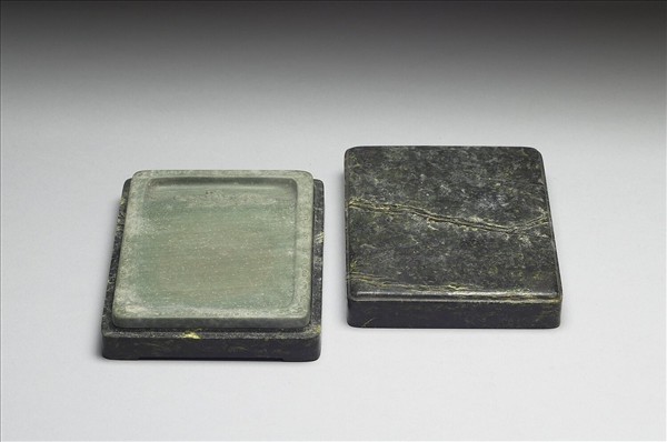 長方形石硯,色灰綠夾灰白色絲紋及斑點。周起邊框,其上淺浮雕雲紋間圈紋,窄硯池,池下雕展翅異獸一,面有略凹圓形為硯堂。硯背中央剔地,陰刻「以靜為用,是以永年」,並鈐「御銘」印。有深綠色蛇紋石硯盒。