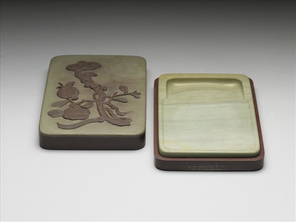 長方形石硯,色黃綠有多層次綠色絲紋,質地細膩。周起邊框,近首硯池周邊框較寬而硯堂處窄。面作略凹圓形成硯堂,光素無紋飾。硯背中央剔地,陰刻「以靜為用,是以永年」,並鈐「雍正年製」篆印。有事事如意雕刻石硯盒一。