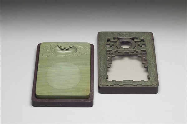 方形綠色石硯,石質潤澤,橢圓臥瓜形池,池周浮雕藤蔓與葉,一葉懸覆於池上方,池右下與左上方各浮雕一隻蜜蜂。硯面留一較粗的橢圓形作墨堂,餘皆打磨光滑。全硯通體有深淺不同之綠色天然橫紋。硯背周邊起寬棱,中央凹下處陰刻行書銘:「以靜為用,是以永年。」並陰刻二行四字篆體方印:「康熙宸翰」。紫色方形硯盒,盒蓋與盒身藉硯身扣合。盒用紫綠兩層色石琢製而成,盒身為紫色,蓋面紋飾為綠色,密佈墨綠色點,浮雕兩兩相視仿古龍紋,龍首在蓋的上邊棱,龍口下方雕一暗紫色璧紋,其上浮雕卷雲紋;龍爪於璧紋下方相連成一橫欄,將概面紋飾隔成上下兩部分。下層方框之上方兩隅各雕一紫色仿古吐舌龍。 紫色部分紋飾皆較綠色部分紋飾低陷。紋飾下嵌一玻璃,可透視硯面。盒背周緣起一圈寬棱,表面並有一層褐黃色塗料。