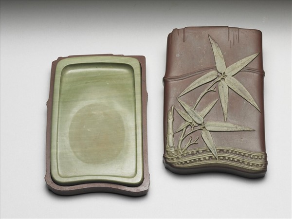 暗綠色不規則四方形硯,微泛黃,硯面周邊起棱,ㄇ形池,硯面下緣因應盒形而曲弧。石質潤澤,通體有深淺不同之綠色天然橫紋,硯面留一較粗之橢圓形受墨處,且尚留硃痕,餘皆打磨光滑。硯背周邊起寬棱,中央凹下處陰刻一直行四字篆書款:「雍正年製」。紫色竹節式硯盒,盒蓋與盒身藉硯身扣合。盒身呈紫色,蓋面浮雕灰綠色晴竹一株,竹葉有仰有俯,一葉並雕有殘破痕,灰綠色竹葉上有天然墨點,錯落分佈;盒蓋作一段竹根形狀,雕飾竹節與灰綠色鬚根殘痕,上端並雕飾竹筠的殘蝕痕。盒背平齊,表面有一層褐黃色塗料,使盒色更亮麗。