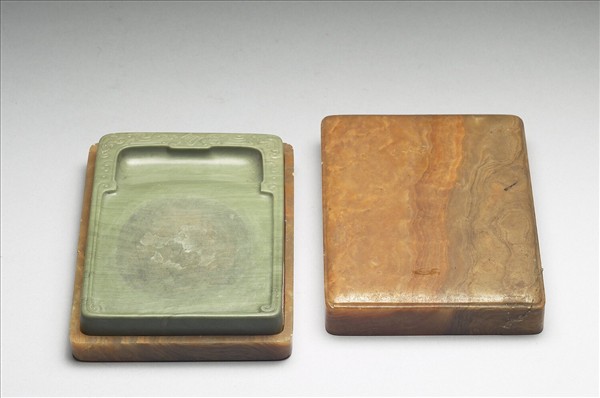 長方形石硯,色灰綠有多層次綠色絲紋。周起邊框,硯唇除下邊外,淺浮雕對稱簡化異獸紋與雲紋,硯池斜下,面作略凹圓形硯堂,中有使用痕。硯背中央剔地,陰刻「以靜為用,是以永年」,並鈐「雍正年製」篆印。有黃石硯盒一。