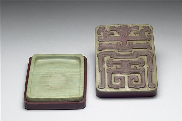 長方形石硯,色灰綠有多層次綠色絲紋。周起邊框,硯池斜下,面作略凹圓形成硯堂,中有使用痕,光素無紋飾。硯背中央剔地,陰刻「以靜為用,是以永年」,並鈐「雍正年製」篆印。有紫色夾綠色松花石硯盒一。