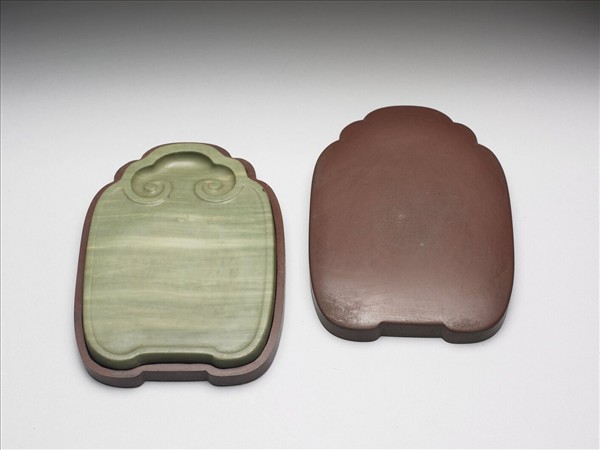 如意雲頭紋造形石硯,綠色並有多層次綠色絲紋。全硯與雲頭形硯池周皆起凸棱,硯池略小,面有微凹圓形成硯堂。硯背中央陰篆「雍正年製」四字款。有赭紅色同形松花石硯盒一。