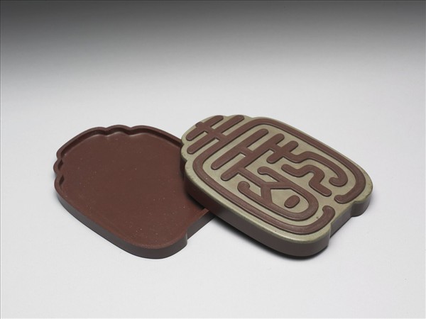 紫色如意壽字形硯盒,利用紫、綠石色層巧雕,以綠色為地,上浮雕紫色篆體壽字。盒背周緣起一圈寬棱,表面並有一層褐黃色塗料,使盒色更亮麗。