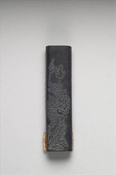 長方形墨,首略弧,邊框起棱,兩側棱面較寬,首尾棱面薄細如線。一面有填金隸字「清香直節」與篆字「御墨」款識,並模鈐填金「得佳趣」三字。一面模印梅花竹葉,花正盛開,又有小鳥兩隻躍飛其間,就中梅竹之象,即喻指「清香」、「直節」之意。墨側有「大清乾隆年製」楷款。