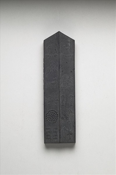 尖首圭形墨,邊框起棱。一面模印波濤紋與雲紋,波濤據墨面左下,祥雲高居上方,墨面中央有填金隸字:「有虞十二章」。另面則模印「有虞十二章」圖像。墨兩側分別有「大清乾隆年製」、「古華軒珍藏」楷款。