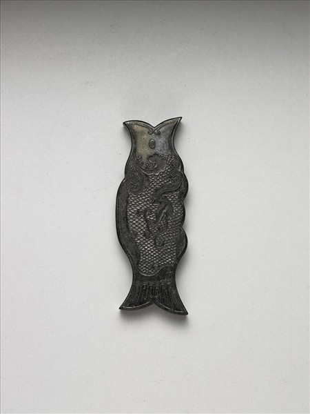 魚形墨,邊框起棱,兩面皆依魚之部位模印相應紋飾,使整墨一如張嘴之魚形。墨側分別有「御墨」、「大清乾隆年製」填金款字。