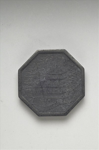 八角形墨,邊框起棱。一面填金隸字「紫閣銘勳」與篆字「御墨」款識,並模鈐填金「幾暇怡情」四字。一面模印屋宇宮殿景觀,建築偉麗矗立雲間。墨側有「大清乾隆年製」楷款。