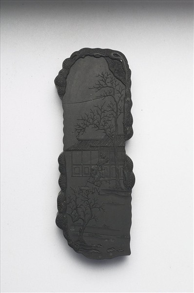 長方形墨,四邊模印松枝松針為飾,使整墨之外廓不規則而類長方。一面有填金楷書乾隆詩作:「上升下降弗相應,閉塞其間若弗通,息以為消消以息,終由乎始始由終,生機黙運誰能識,造物鴻功自不窮,王者奉天無二道,一心祗在體元中。御製閉塞而成冬。」並帶「臣」、「文」、「埴」款識,可知字跡為曹文埴所書。一面模印屋舍庭景,並有兩人在其中。此墨與其他墨同儲於一盒。(故文363-373)