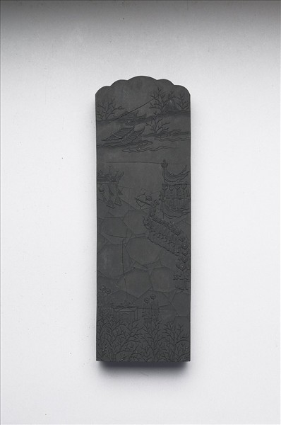 碑碣形墨。一面有填金楷書乾隆詩作:「卦在坎還支在亥,亥為剛地坎為川,無非氣運神而化,自合凍凝腹乃堅,太液冰嬉頒賞賚,萬年國俗寓機權,貞元遂啓三陽泰,七十二章吟以全。御製水澤腹堅。」並帶「臣」、「埴」款識,可知字跡為曹文埴所書。一面則有人物多個列排成隊,中有一人張弓欲射,地表冰裂,應即另面詩作所描寫冰上嬉遊之圖像。此墨與其他五墨同儲於一盒。(故文381-386)