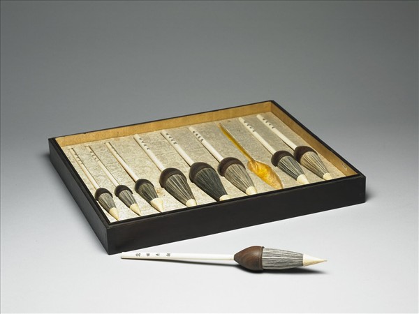 斗筆,象牙質細長筆桿,下接木質筆管,筆管端作上窄下闊的斗狀,以容較多的筆毫,亦稱筆斗。管身仍細,使易於持拿,筆桿上有刻有「萬國來朝」四楷字。此筆與其他八枝斗筆同儲於一盒。