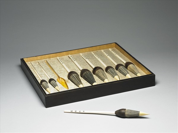 斗筆,象牙質細長筆桿,下接木質筆管,筆管端作上窄下闊的斗狀,以容較多的筆毫,亦稱筆斗。管身仍細,使易於持拿,筆桿上有刻有「萬福攸同」四楷字。此筆與其他八枝斗筆同儲於一盒。
