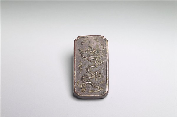 長方形墨,暗朱色,四角內凹,邊框起棱,棱上塗飾金彩。墨之一面模印飛龍搶珠,並以金彩塗飾。另一面則壓印「龍香御墨」、「大明隆慶年製」楷書字樣。此墨與其他四錠彩墨同儲於一木匣。
