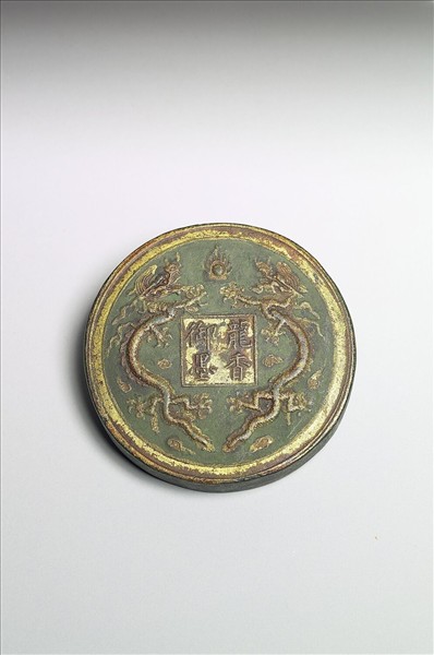 綠色墨錠,圓形香餅狀,一面模印陽文凸起之雙龍戲珠紋,中央方印有陽文楷字:「龍香御墨」,邊框及模印紋皆金彩。另一面中央模印陰文直行楷款:「大明隆慶年製」。墨料中似摻有香料,雜色星點佈於墨面上,嗅之濃香。