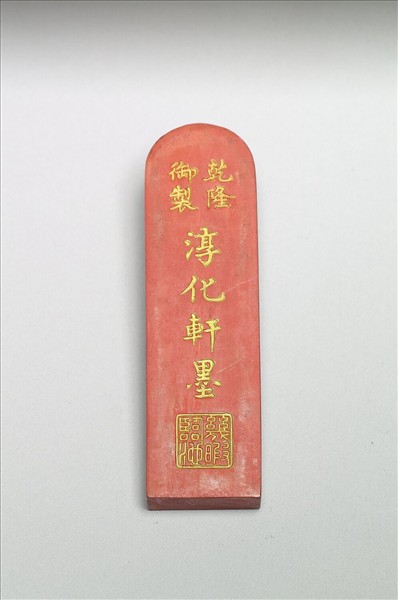 碑碣形硃墨,紅色。一面模印一文臣持笏左向,復以金彩塗飾人物,而人物上方有篆文填金:「回氐」二字。另一面則有填金楷款「淳化軒」、「乾隆御製」,復押印填金「幾暇臨池」之印。由「淳化軒」與「幾暇臨池」看來,或是標誌該墨之出產地、使用地與功能。此墨一式十件,同儲於一木匣。