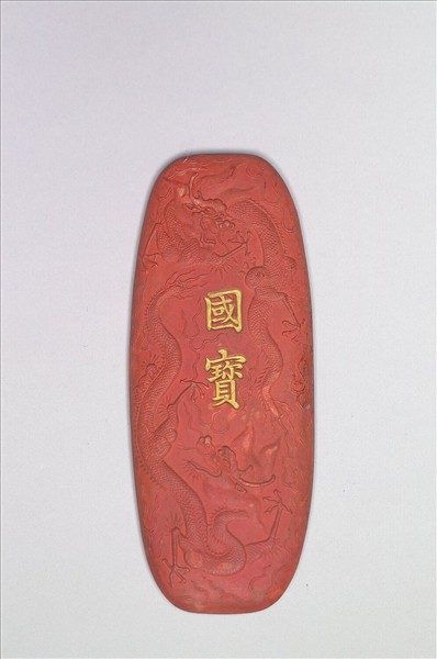 硃砂顏料墨。器作牛舌式長方圓碇形,四角圓弧,中央厚而端薄。一面模印雙龍,龍有雙角長鬚髮,鱗爪細緻身周飾火焰紋,中戧金「國寶」,另一面四端模印雲頭紋,中戧金「大清乾隆年造」。