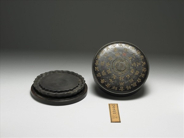 此硯乃根據內府所收〈唐蔆鏡硯〉仿製,硯作九瓣蔆花,底有三足,硯背上方刻「仿唐蔆鏡硯」五字及乾隆乙未(四十年,1775)御題銘。有紫檀木匣。