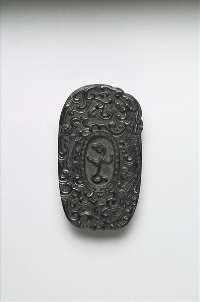黑墨,近橢圓而類玉佩之形。兩面皆模印一龍飛繞於雲間,墨面中央有一橢圓形開光,開光中皆有一小龍子。墨側有「大清乾隆年製」、「御墨」填金款識。此墨與其他九墨同儲於一屜。