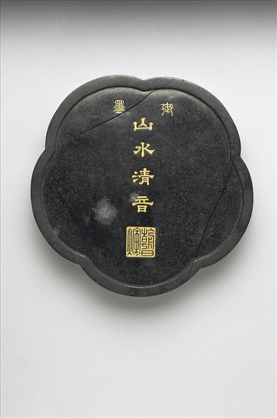 五瓣花形墨,邊框起棱。一面模印「御墨」篆字,以及「山水清音」隸字,並模鈐「朝日煇」三字,墨面上之字樣均有填金以為飾。一面模印山岳景色,一山居中而四面環水,四角又各有一山圍伺,各山之上均見屋宇。墨側有「大清乾隆年製」、「淵映齋珍藏」楷款。此墨與其他九墨同儲於一屜。