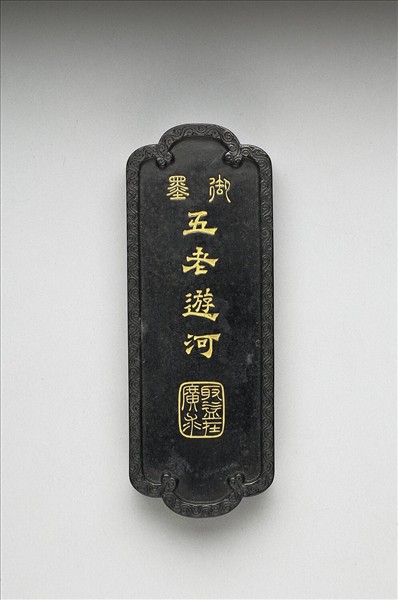 長方形墨,首尾兩邊有弧狀凸起,使外廓一如碑碣之形,邊框起棱,棱面滿飾雲紋。一面有填金「御墨」、「五老遊河」,並模鈐「取益在廣求」五字。另面模印七人聚集於水邊,正相互交談,當即描寫堯舜同遊,後遇五老於水邊的故事。墨側有「大清乾隆年製」、「頤和軒珍藏」楷款。此墨與其他九墨同儲於一屜。