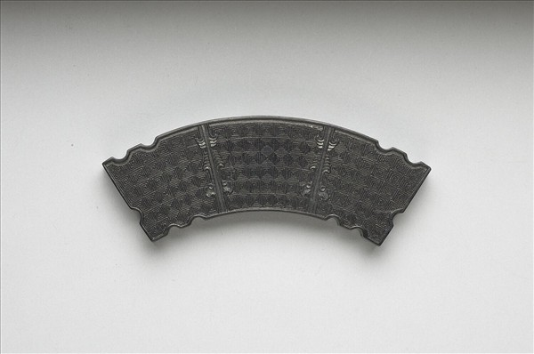 璜形墨,外廓有半圓形凹入,邊框起棱。墨之兩面均以回紋為地,並模印類如意、雲頭之花紋為飾。墨之側有「大清乾隆年製」、「御墨」填金款識。此墨與其他九墨同儲於一屜。
