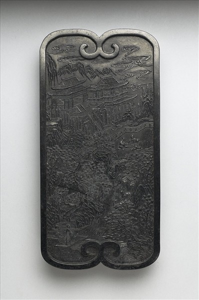 長方形墨,四角圓弧,首尾,邊框起棱,邊棱於墨面首尾皆交接為一雲狀紋。一面填金隸字「仙山樓閣」與篆字「御墨」款識,並模鈐填金「煙雲舒卷」四字。一面模印山水樓閣景觀,山間樓閣偉麗,雲霧環繞如在仙境,樓前有人聚坐奕棋,墨面左下一人正過橋前行,或即欲入山訪道者。墨側有「含經堂珍藏」、「大清乾隆年製」楷款。此墨與其他九墨同儲於一屜。