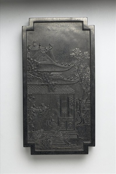 長方亞形墨,邊框起棱。一面模印填金篆字「御墨」、隸字「黼黻昭文」,並模鈐「含英咀華」四字。一面則模印屋舍園景,屋內有女子正作穿針引線之勢,與墨譜中「世掌絲綸」墨樣類同。墨側模印有「大清乾隆年製」、「涵光室珍藏」楷款。此墨與其他九墨同儲於一屜。
