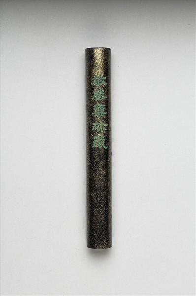 長條形圓柱墨,表面灑金為飾,面上模印楷字「大清乾隆年製」、填綠彩隸字「敬勝齋珍藏」款識,並模鈐「玉質」、「金相」二印。此墨與其他九墨同儲於一屜。