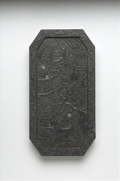 長方形墨,四角截去而呈八角形,邊框起棱,稜面模印雲紋與蝙蝠紋。一面填金篆字「御墨」、隸字「蘭亭高會」款識,並模鈐填金「大塊假我以文章」七字。一面模印蘭亭修禊圖像,人物眾多,三三兩兩,聚坐於流水旁,或相對討論,或張紙執筆,或正勾取水中之流觴,正是王羲之《蘭亭集序》一文所描寫的圖像。墨側有「大清乾隆年製」、「延趣樓珍藏」楷款。此墨與其他九墨同儲於一屜。