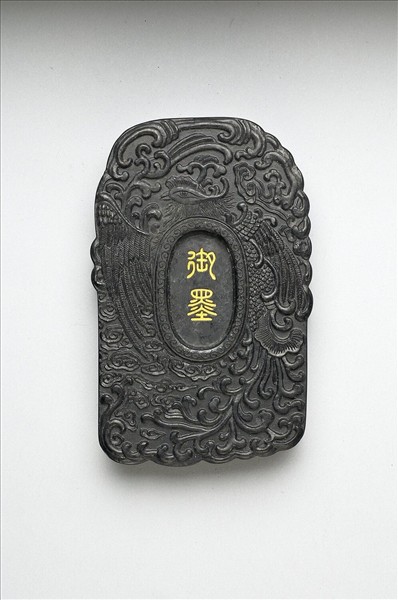 黑墨,外廓為卵形近方,墨面皆模印一鳳飛舞雲間,並曲身繞圍墨面中央橢圓形開光,兩面之開光分別飾以填金「御墨」篆字與「來儀」隸字。墨側有「大清乾隆年製」楷款。此墨與其他三墨同儲於一盒。