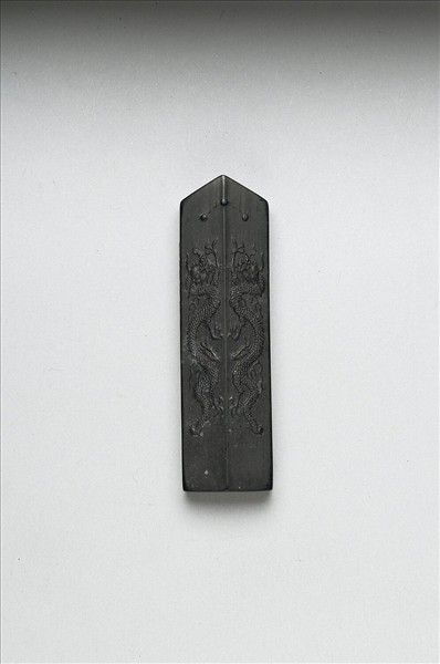 尖首圭形墨。一面模印雙龍紋與龍珠為飾,墨面中央有一直線突起如鑄範線,雙龍以此為界,各據一側。另面有填金隸字:「青圭」並模鈐「御墨」款字。墨側有「大清乾隆年製」楷款,此墨與其他三墨同儲一屜。