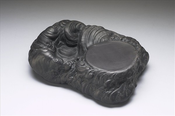 此硯為端溪子石。全器硯面及背滿刻海水波浪洶湧澎湃之中,擁襯一輪朝日,是作硯堂,硯首海浪低漩即作墨池。硯背在海浪洶湧中,浮硯一旭日,中淺浮雕一三足鳥。硯右側壁平坦處,鐫清高宗御題銘乙首,隸書、「洪波浡潏天之綱,咸池沐浴陽德光,紫雲既劚金烏翔,葆珍韞彩登文房,挹茲學海吐沛滂。」款題:「乾隆乙未春御題」(四十年,1775),鈐印二:「古香」、「太璞」。