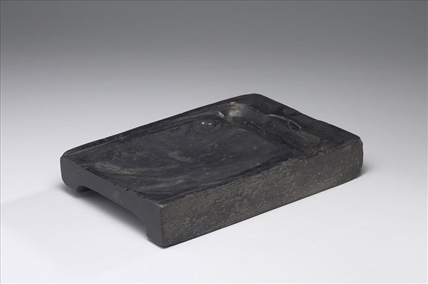 抄手式長方形石硯,色紫黑,全器有多處碰傷與裂痕。硯周三邊起邊框,硯首上飾琢淺弦紋一道,硯堂寬闊中央略凹,向硯首斜下為池,硯池深窄。硯背有宋人辛文悅、李沆二人詩文,硯首側壁則題乾隆御製詩文。有同御製詩嵌玉木盒。