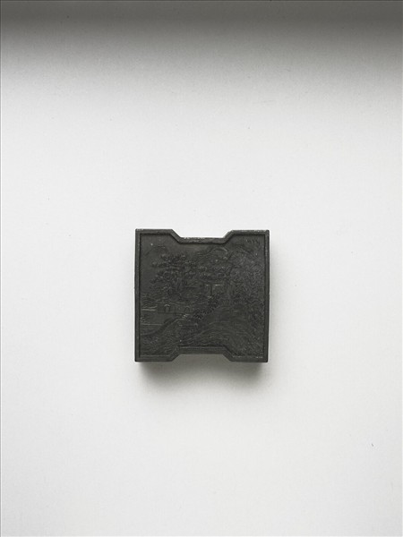 幾何形墨,形如正方而有兩邊內凹,略近沙漏之形,邊框起棱。一面有填金乾隆楷書詩作:「御製題法鏡寺,庚子。三天竺以斯稱古,塔矗神尼峰護蓮,成佛夢誰靈運後,翻經詠憶樂天前,尋奇恰值暮春節,題額猶思壬午年。點綴微嫌曾昔麗,莊嚴本意豈其然。」另一面則模印屋舍景觀,據乾隆詩作可知該圖為描繪西湖名景「法鏡寺」者。此墨與其他八塊墨各自表現西湖名景,而成一套「西湖名景」套墨,俱同儲於一盒。