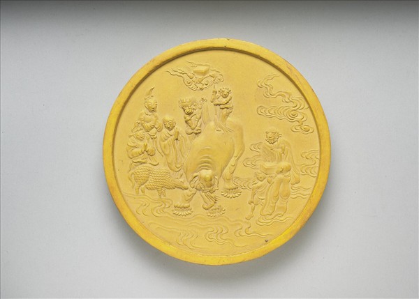 圓形黃色墨,邊框起棱。一面模印掃象圖,瑞象足踏蓮花,背上一小童持帚清潔,二側各有神人作合什狀,並有異獸、經函,皆立於祥雲之上。另一面有長方形開光,開光中壓印填黑篆字「大藏寫經之墨」。墨側有「方于魯監製」楷款。此墨一式五件,顏色各異而為彩色套墨,五件俱同儲於一盒。