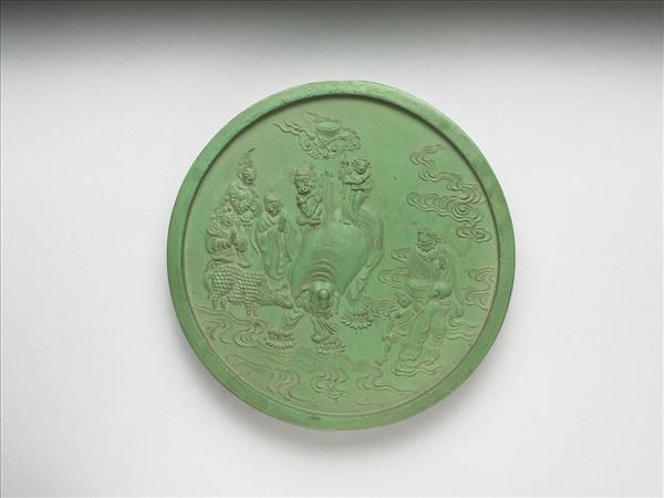圓形綠色墨,邊框起棱。一面模印掃象圖,瑞象足踏蓮花,背上一小童持帚清潔,二側各有神人作合什狀,並有異獸、經函,皆立於祥雲之上。另一面有長方形開光,開光中壓印填金篆字「大藏寫經之墨」。墨側有「方于魯監製」楷款。此墨一式五件,顏色各異而為彩色套墨,五件俱同儲於一盒。