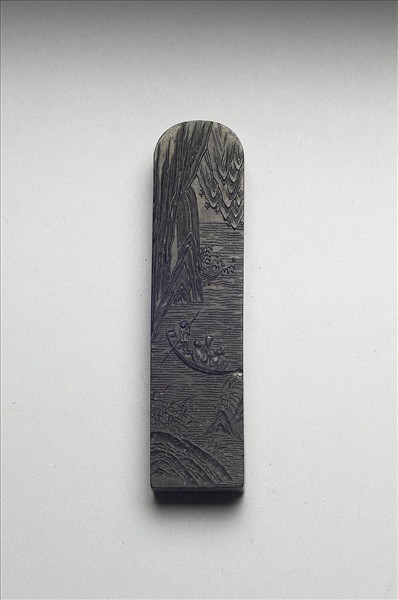 圓首碑碣形墨。一面填金隸字「赤壁圖」與篆字「御墨」款識,並模鈐填金「掬水月在手」五字。一面模印一舟於江中,舟上人正相語歡談,水面微波,風過草偃,山壁列圍,正是蘇軾《赤壁圖》描寫之一景。墨側有「大清乾隆年製」楷款。此墨與其他二十九墨同儲於一盒。