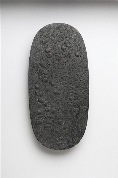橢圓形墨,一面填金篆字「御墨」與隸字「春華秋實」,並模鈐「寓意於物」四字。另面則模印花果植生,滿飾墨面而有生長繁盛之像,應即呼應「春華秋實」而為此。墨側有「大清乾隆年製」、「蘊真齋珍藏」楷款。此墨與其他二十九墨同儲於一盒。