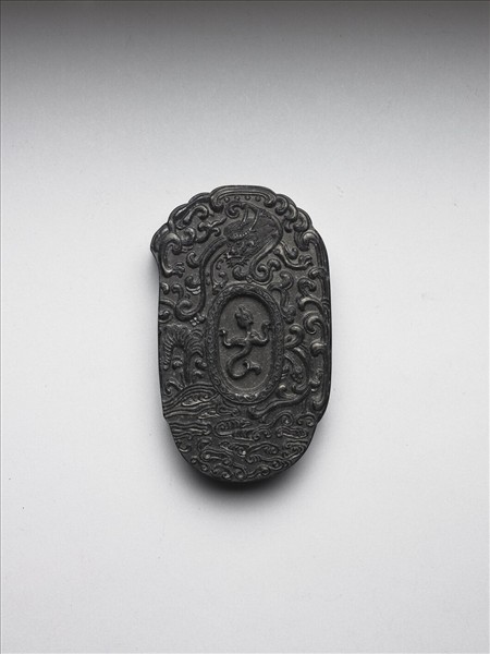 黑墨,近橢圓而類玉佩之形。兩面皆模印一龍飛繞於雲間,墨面中央有一橢圓形開光,開光中皆有一小龍子。墨側有「大清乾隆年製」填金款識。此墨與其他二十九墨同儲於一盒。