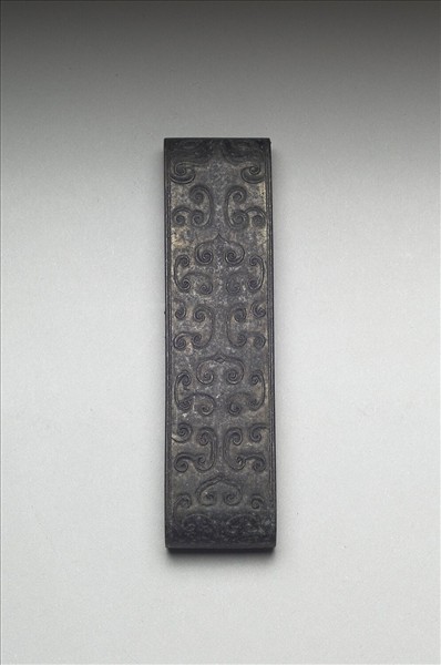 璏形墨,整器全仿玉璏之形制。面上滿飾卷雲紋。背面填金模鈐「天府永寶」及「古香」二方印款,並有「大清乾隆年製」、「樂壽堂珍藏」填金楷款。此墨與其他二十九墨同儲於一盒。