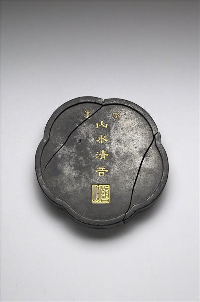 五瓣花形墨,邊框起棱。一面模印「御墨」篆字,以及「山水清音」隸字,並模鈐「朝日煇」三字,墨面上之字樣均有填金以為飾。一面模印山岳景色,一山居中而四面環水,四角又各有一山圍伺,各山之上均見屋宇。墨側有「大清乾隆年製」、「淵映齋珍藏」楷款。此墨與其他二十九墨同儲於一盒。
