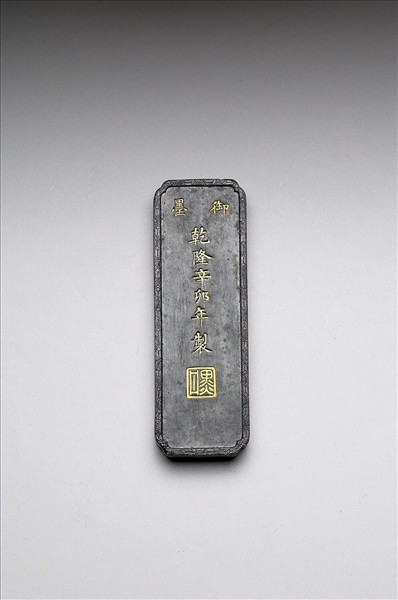 長方形墨,四角內凹,邊框起棱。一面有填金楷字「御墨」、「乾隆辛卯年製」,並模鈐「黑丹」。另面則模印山水景色。此墨與其他十一墨同儲於一屜。