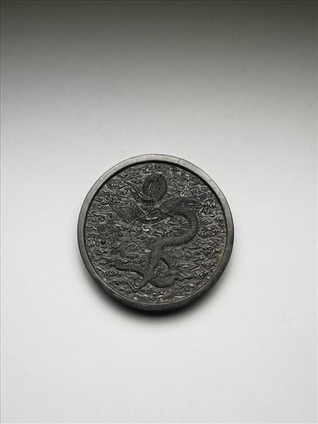 圓形墨,邊框起棱。一面模印蟠龍居中,龍珠在側,隙地滿飾雲紋。另面則有填金篆字:「御墨」,「御墨」字樣下方有一長方形開光,開光中模印「雲行雨施,萬國咸寧」八篆字。墨側有「大清乾隆年製」楷款。此墨與其他六墨同儲於一屜。